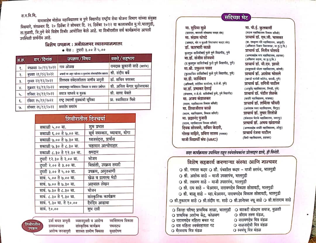 | 13 | NSS Camp | -- | Social | NSS Unit | Student | A/P Belawade, Tal-Mulshi,Dist -Pune | -- | Dr.Ashok Shelke | 2024-01-13 | 09:01 AM | 2024-01-19 | 04: PM | Nss Camp patrika 2023-24.pdf |