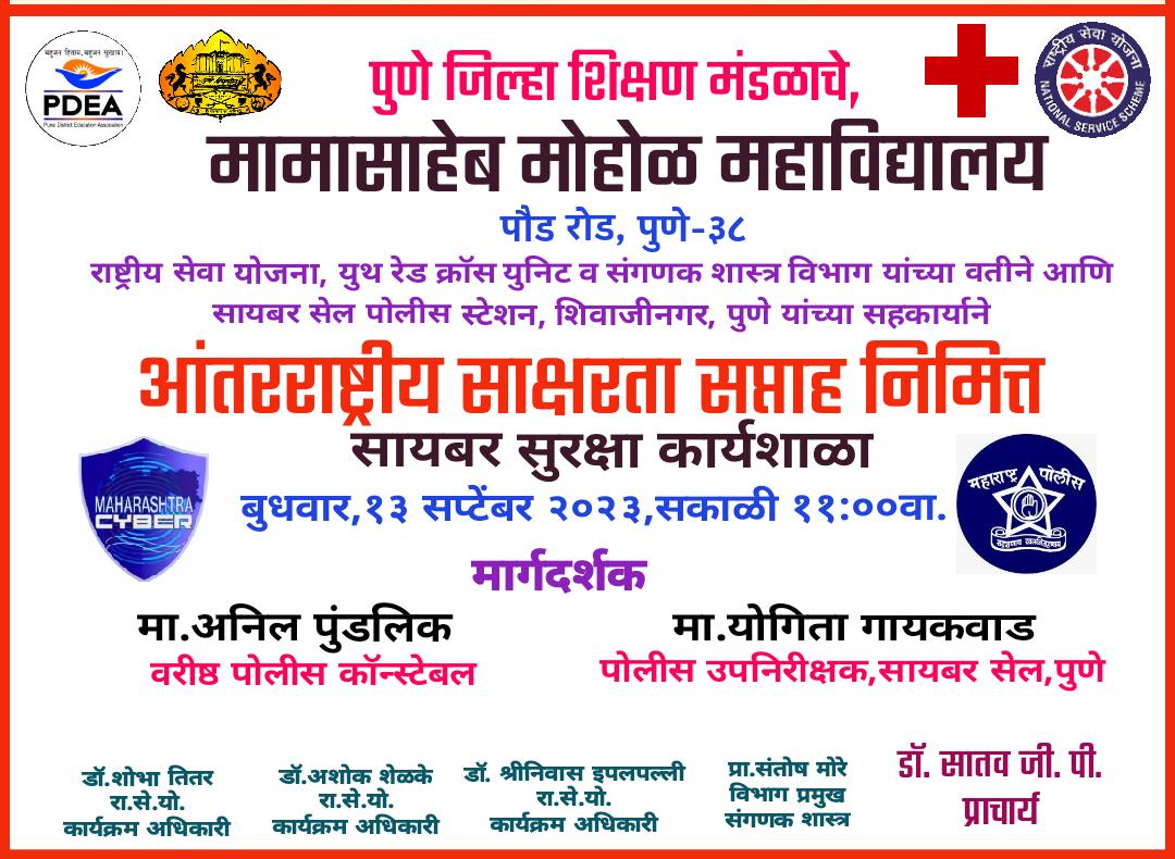 | 23 | Cyber Security workshop | साक्षरता सप्ताहासाठी | Academic | PDEA | All Students | Mamasaheb Mohol College | -- | Dr. Satav .G.P. | 2023-09-13 | 11:00 AM | -- | :59 PM | cybersecworkshop.jpeg |