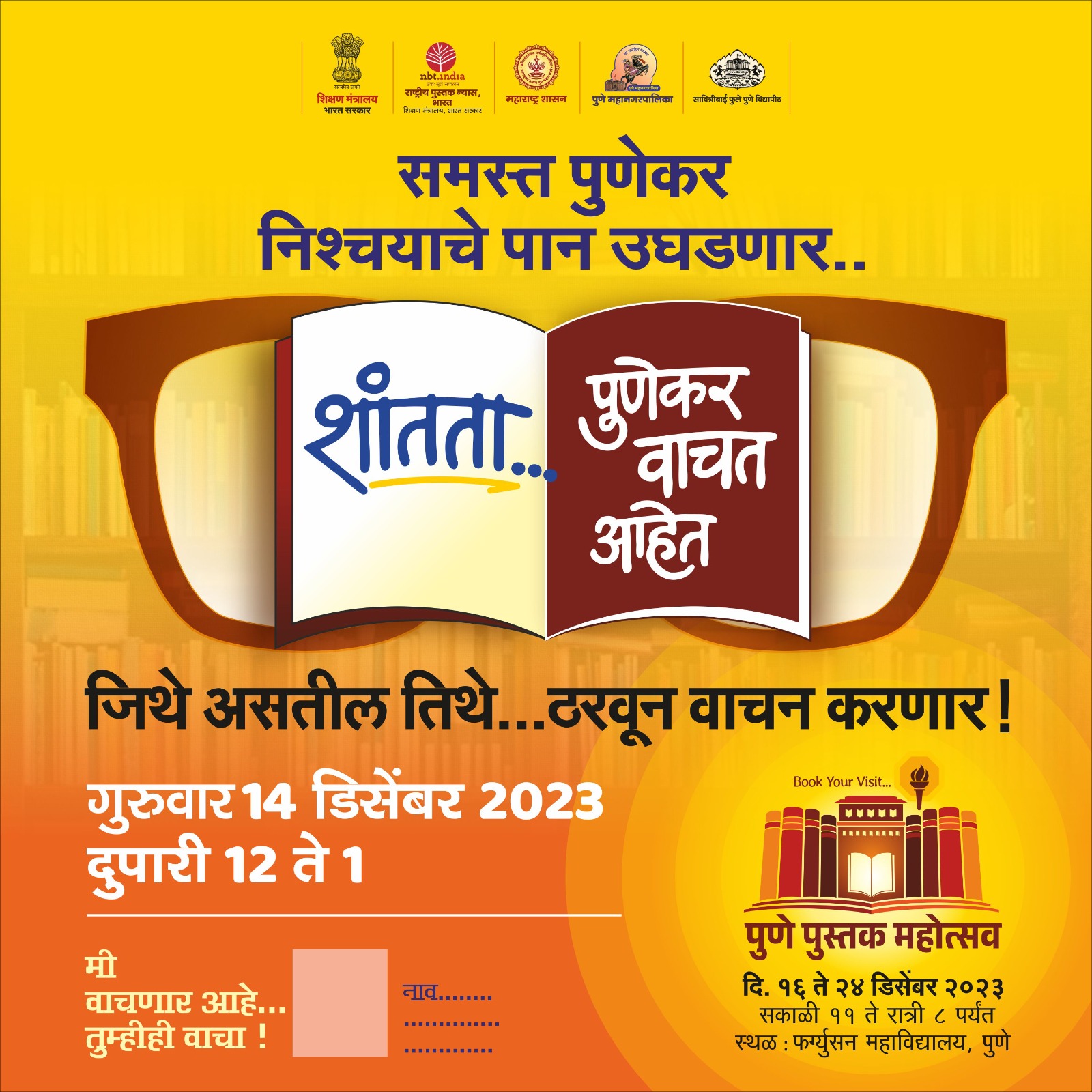 | 19 | Pune Book Festival | शांतता - पुणेकर वाचत आहे, गुरुवार १४ डिसेंबर २०२३ दुपारी १२-०१ | Academic | Library Department | Students and Teachers | Hall no. 1 | -- | Dr. Avaghade | 2023-12-14 | 12:00 PM | -- | : PM | Pune Book Festival.jpeg |