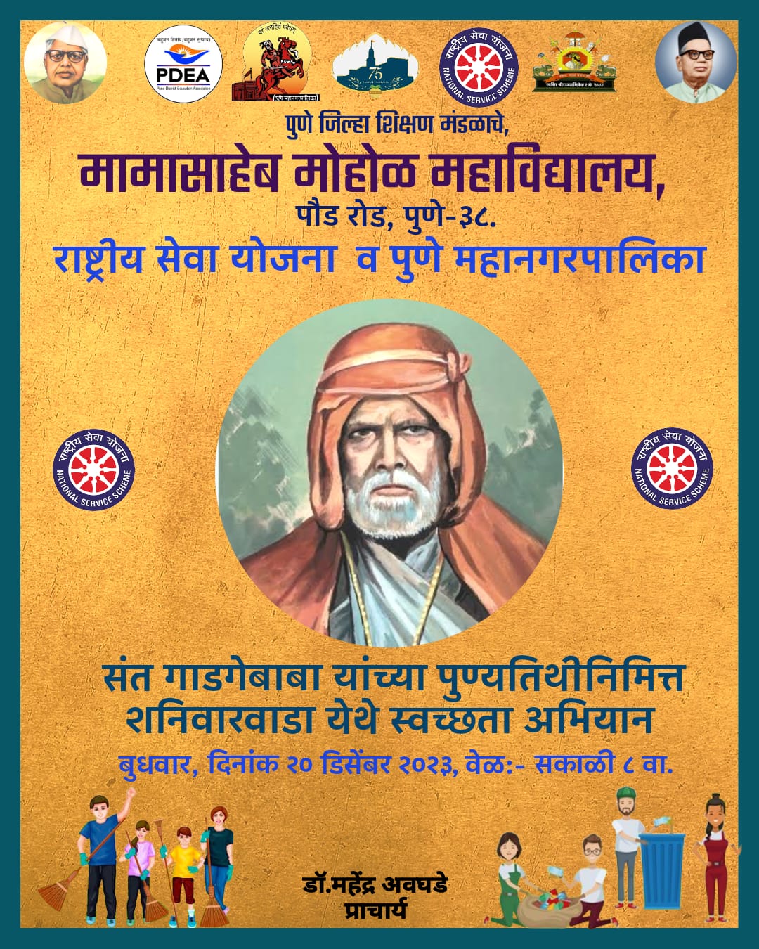 | 18 | Swachata Abhiyan | संत गाडगेबाबा यांच्या पुण्यतिथी निम्मित्त शनिवारवाडा येथे स्वच्छता अभियान | Social | NSS Dept. | Everyone | Shaniwar Wada | -- | Dr. Avaghade | 2023-12-20 | 08:00 AM | -- | : PM | swacchata abhiyan.jpeg |