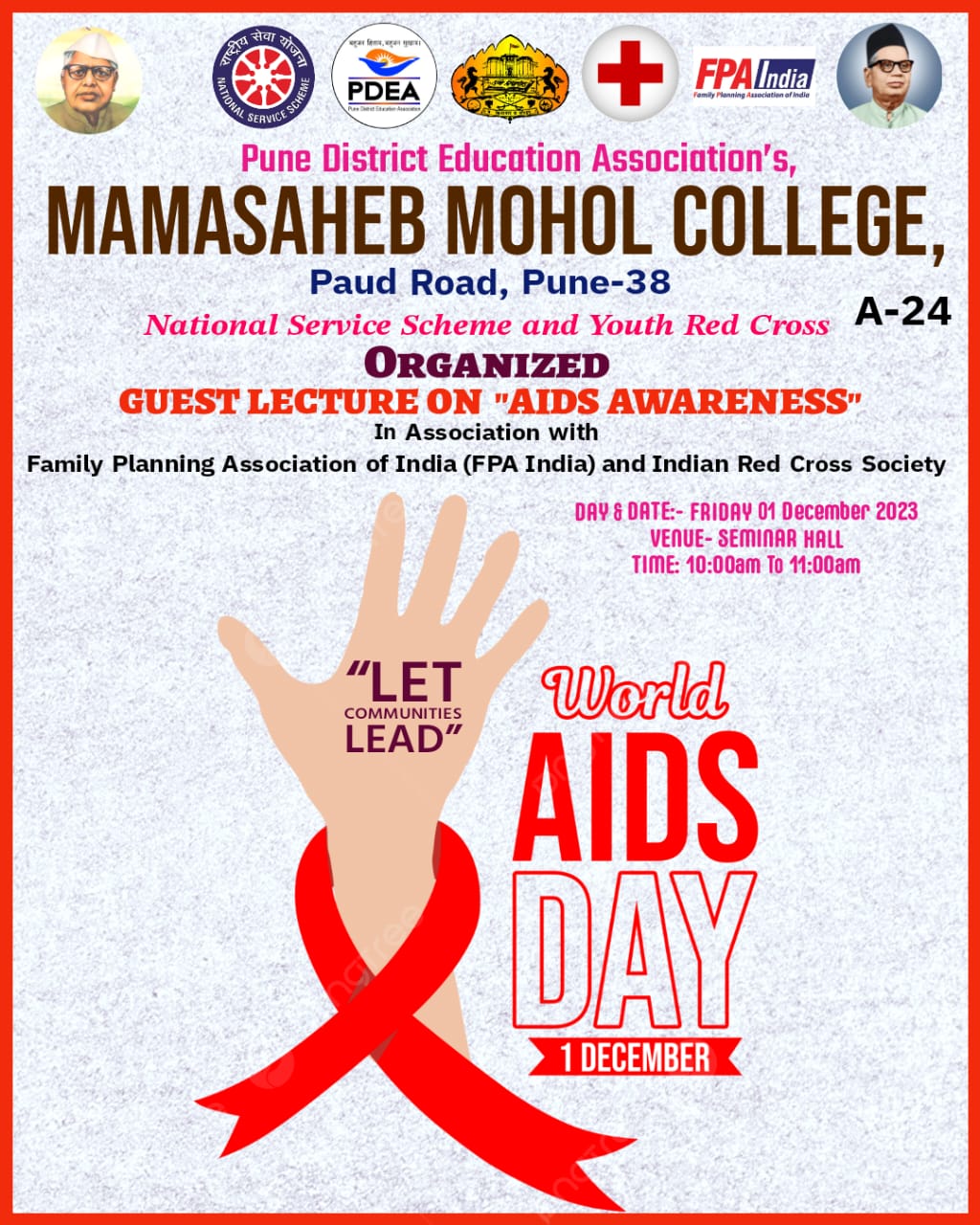 | 17 | AIDS Awareness | -- | Social | NSS - Red Cross | Students and Teachers | -- | -- | FPA India | 2023-12-01 | 10:00 AM | 2023-12-01 | 12:00 PM | AIDS Day.jpeg |