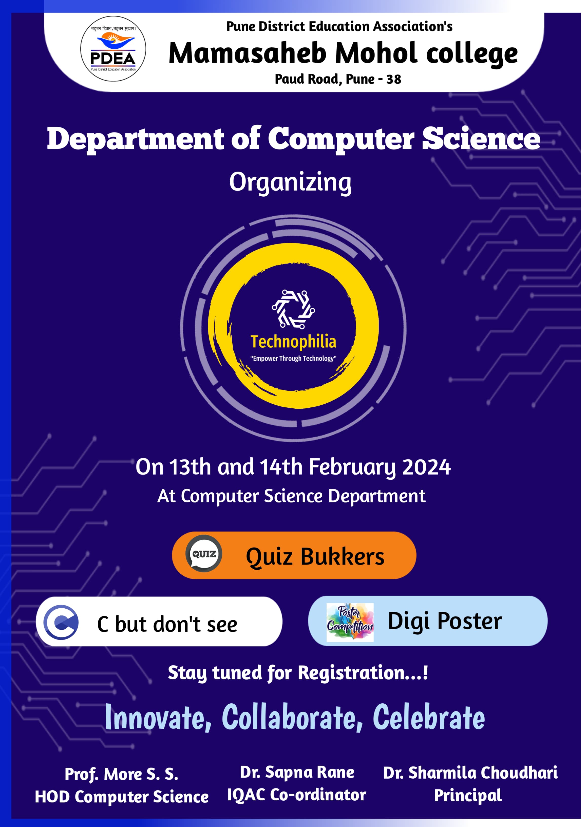 | 7 | Technophilia 2k24 | -- | Academic | Prof. S.S. More | Students | -- | -- | Prof. S.S. More | 2024-02-13 | 09:00 AM | 2024-02-16 | 11:00 AM | Technophilia Poster (3).jpeg |