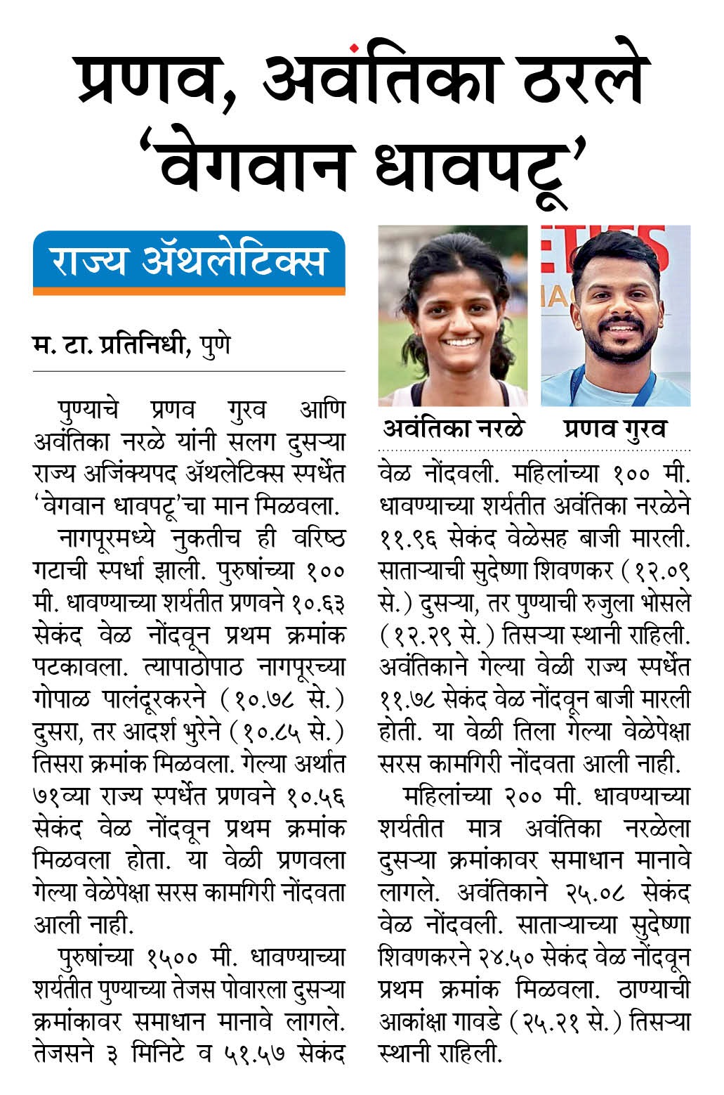 | 2023-08-23 | Avantika Narale @nd in Sprint race | Avantika Narale secured 2nd position in 100 mts sprint at the All India Railway championship held at MCF Reabarali | -- |