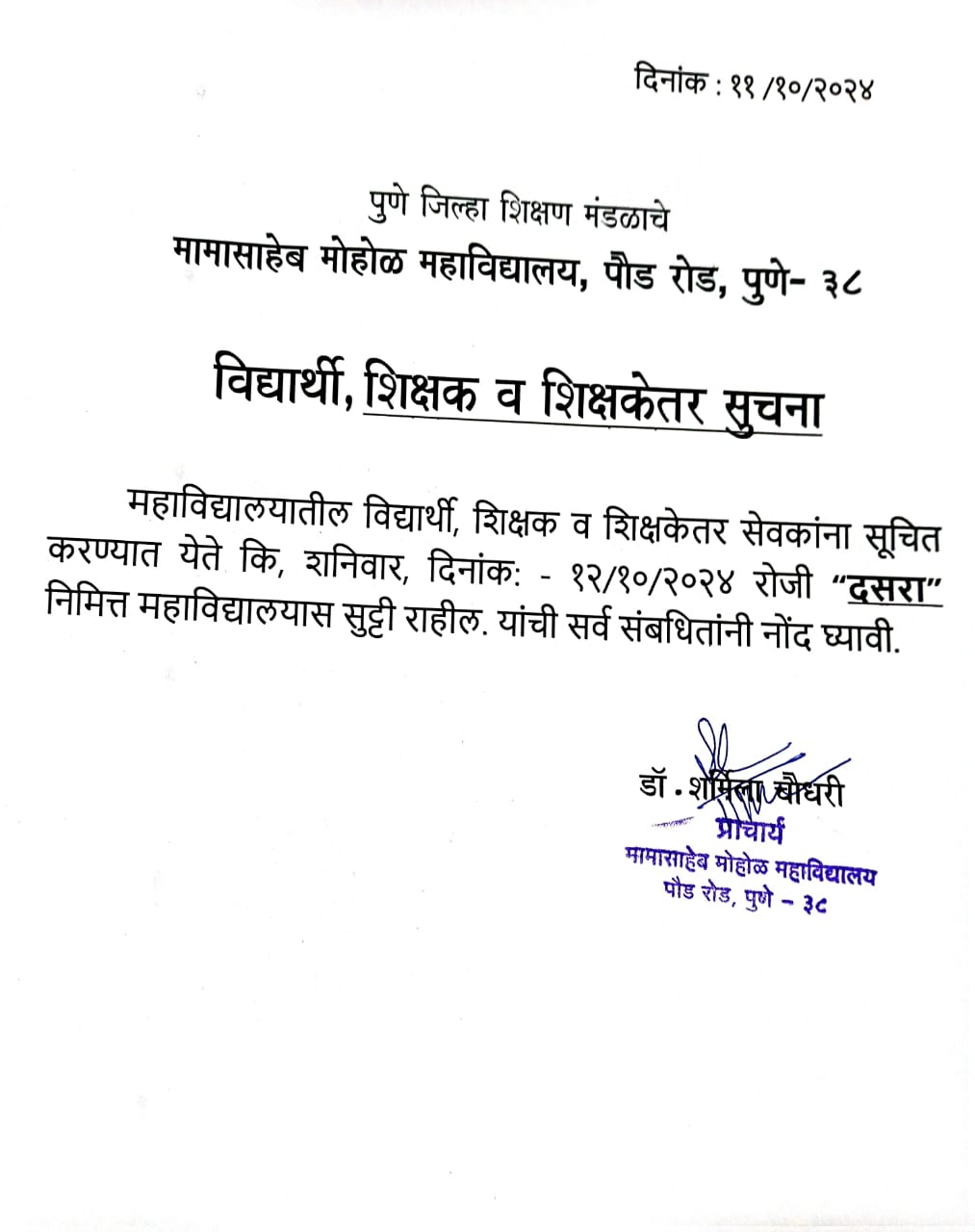 | 2023-10-20 | कुस्ती स्पर्धेमधa !! | 57 किलो वजन गटामध्ये मामासाहेब मोहोळ महाविद्यालयाच्या कु. ओंकार कोळी याने रौप्यपदक तर कु. अथर्व काळभोर याने कांस्यपदक मिळवले. | kustispardha.jpeg |