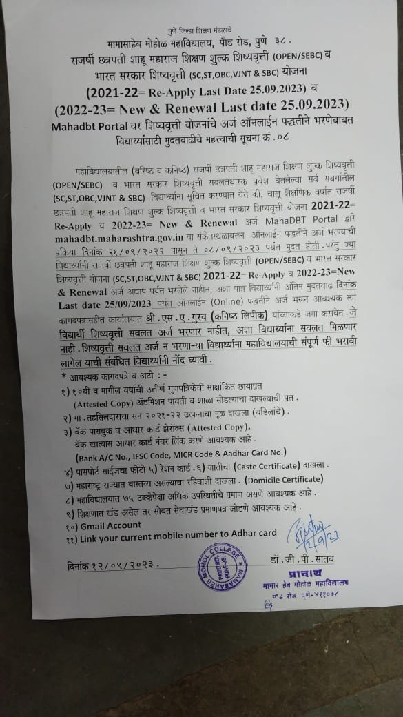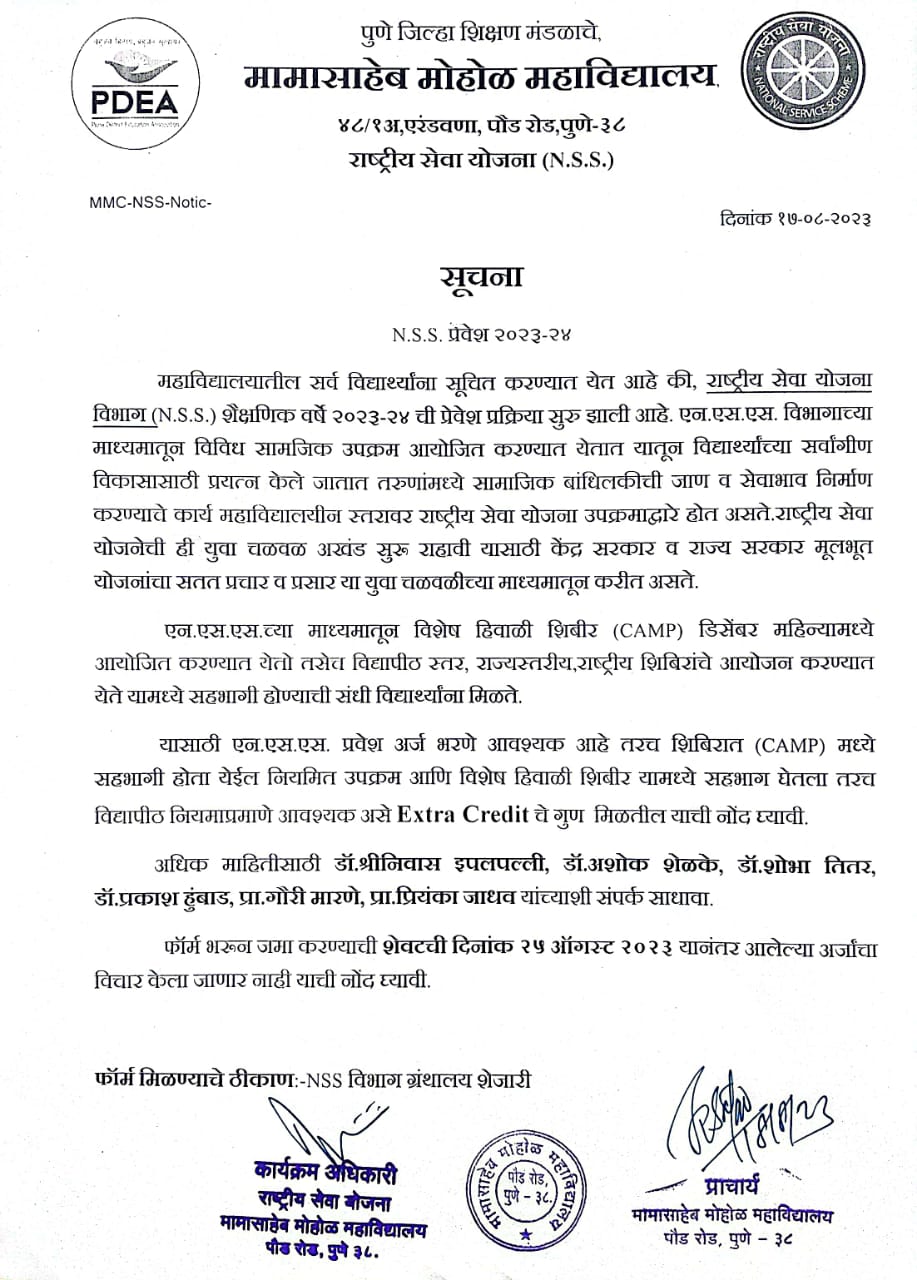 | 2023-07-01 | शिष्यवृत्ती बाबत महत्वाची सूचना | शिष्यवृत्ती online form भरण्यास ५ वी मुदतवाढीचे महत्वाची सूचना | NSS Admissions 2023.jpeg |