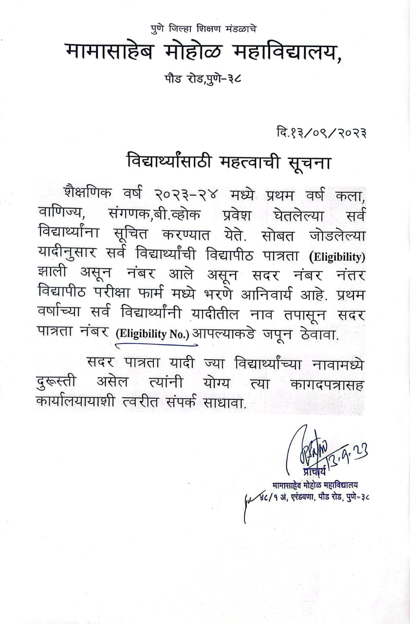 | 2023-09-13 | Create Eligibility Number | all B.voc students are requested to create and submit eligibility numbers to their respected class teachers | eligibility number.jpeg |