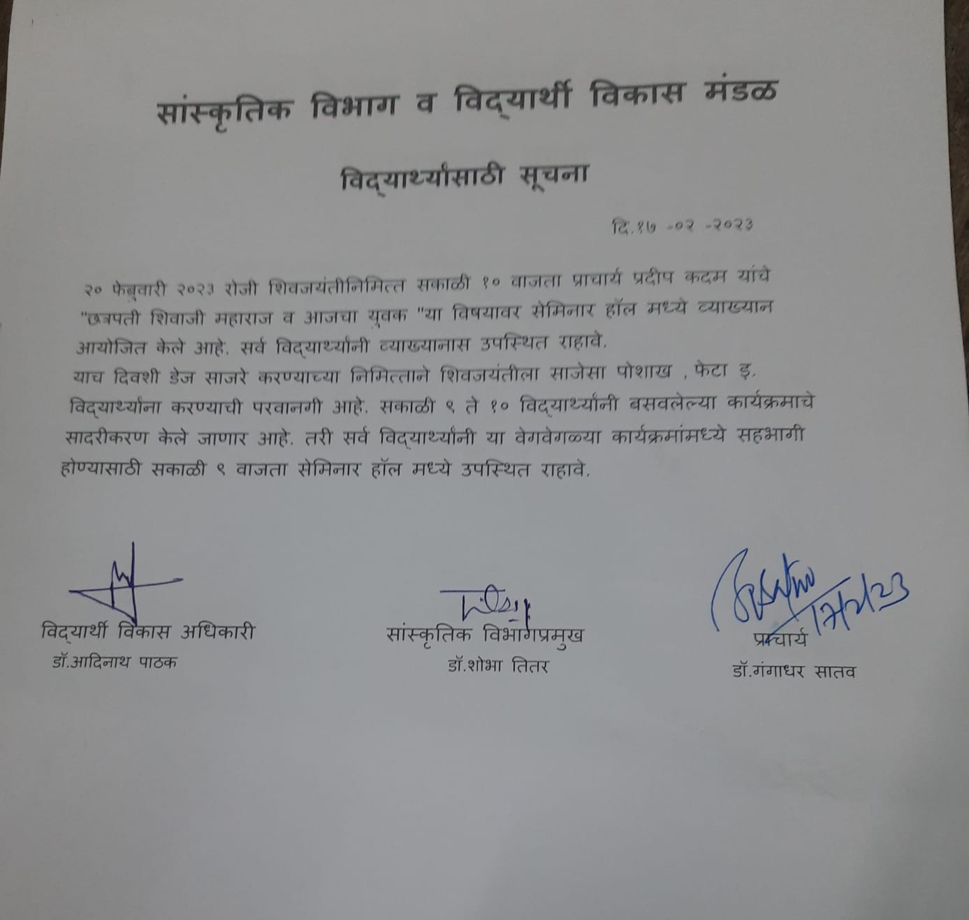 | 2023-02-16 | Chatrapati Shivaji Maharaj & Todays Youth | Cultural and Student Development Board have organized a seminar on Chatrapati Shivaji Maharaj & Todays Youth | cultural seminar.jpeg |